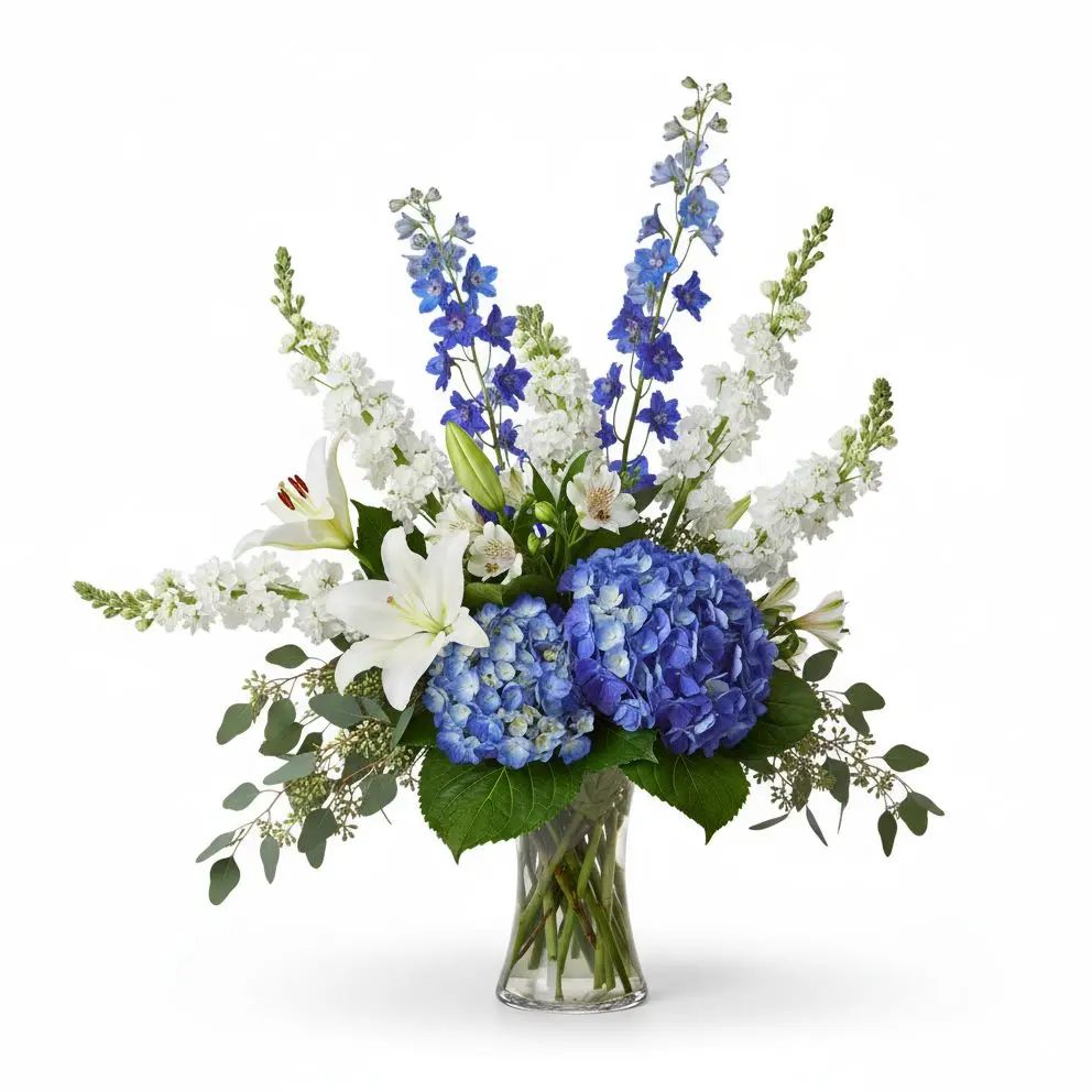 Embrace the serene beauty of our Blue Dream, a breathtaking arrangement of blue hydrangeas and elegant white lilies that evokes a sense of calm. Each bloom is carefully selected to create a harmonious blend, bringing joy and tranquility to any space. Perfect for celebrating life's precious moments, this bouquet is a true masterpiece.