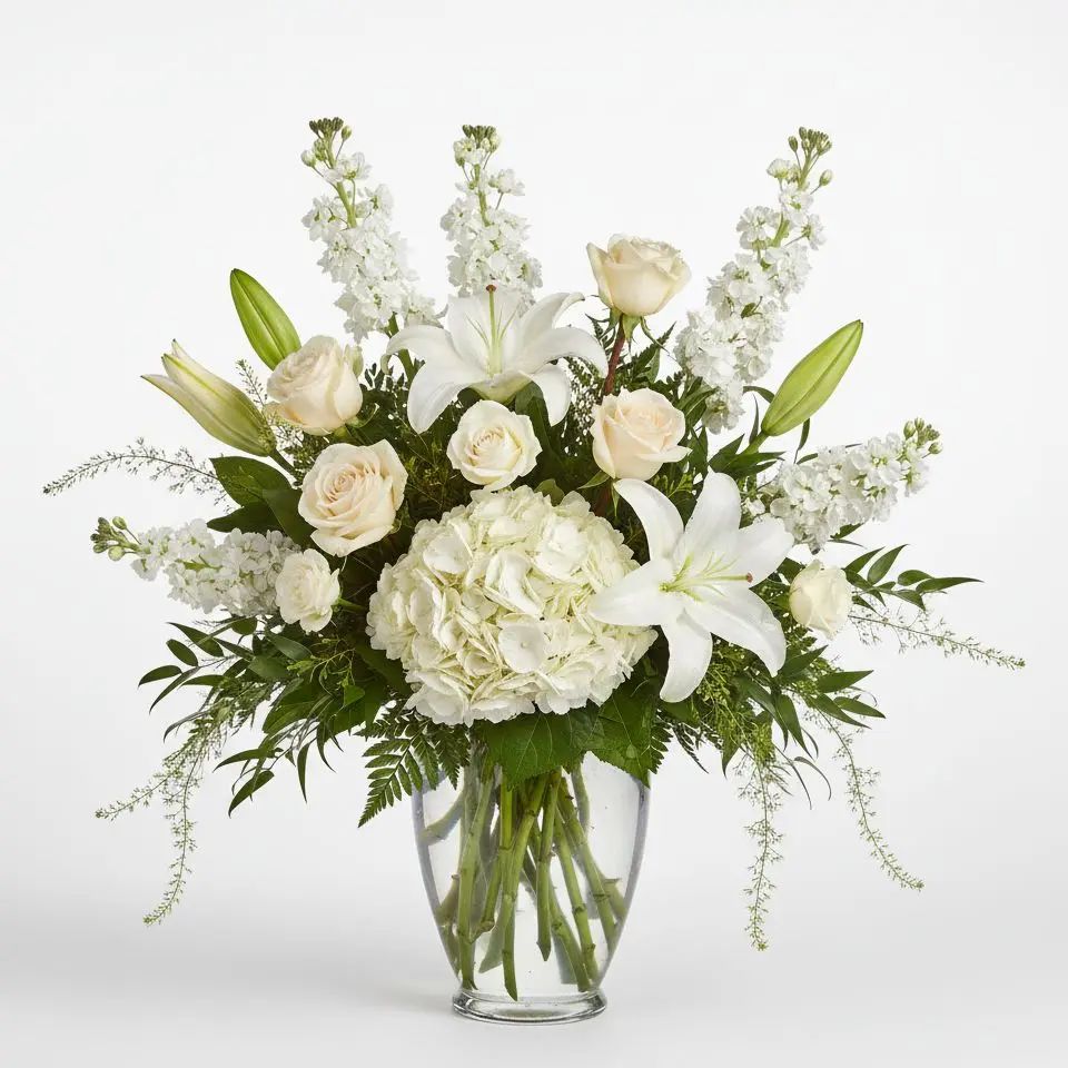 Experience the serene beauty of the Ivory Whisper, a breathtaking arrangement of elegant white hydrangeas, creme roses, and fragrant lilies. Presented in a clear glass vase, this stunning floral design brings a touch of pure sophistication to any space. It's the perfect way to brighten someone's day or add a peaceful ambiance to your home.